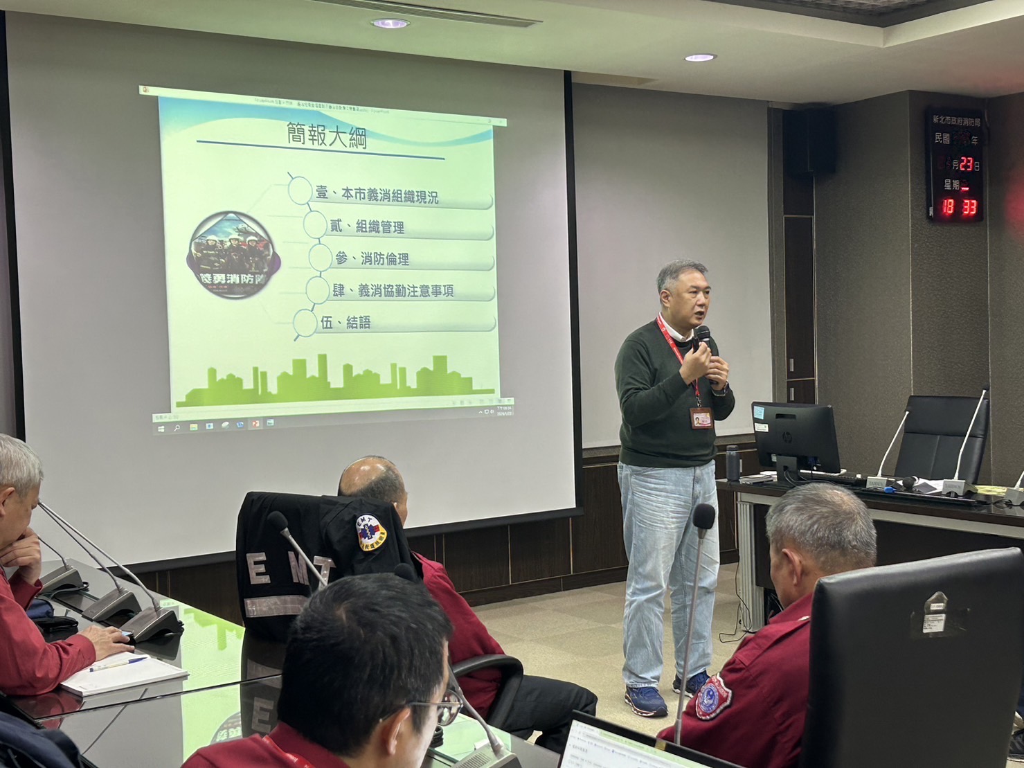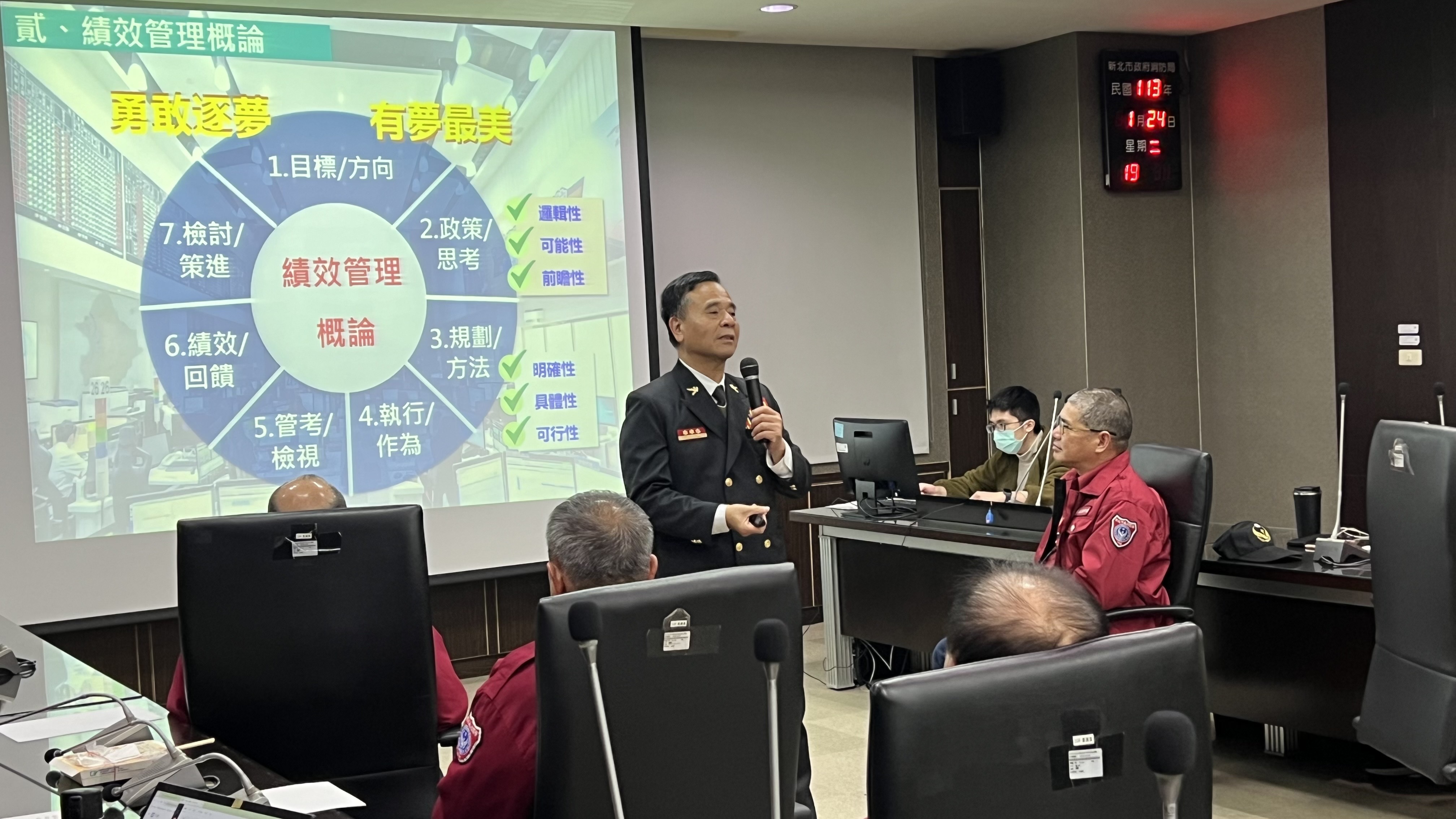 詳細內容:本局分別於113年1月22日至25日於局本部1001會議室辦理義消中級幹部講習,並邀請李清安局長、張易鴻主任秘書授課,分享組織管理、消防倫理等觀念。