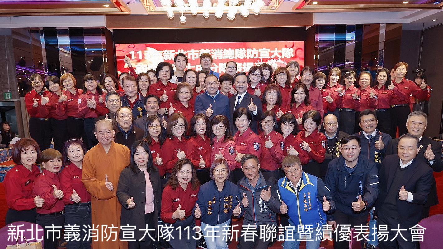 詳細內容:113年3月8日侯友宜市長出席績優防宣義消表揚大會,與消防、義消各級幹部及民意代表合影。