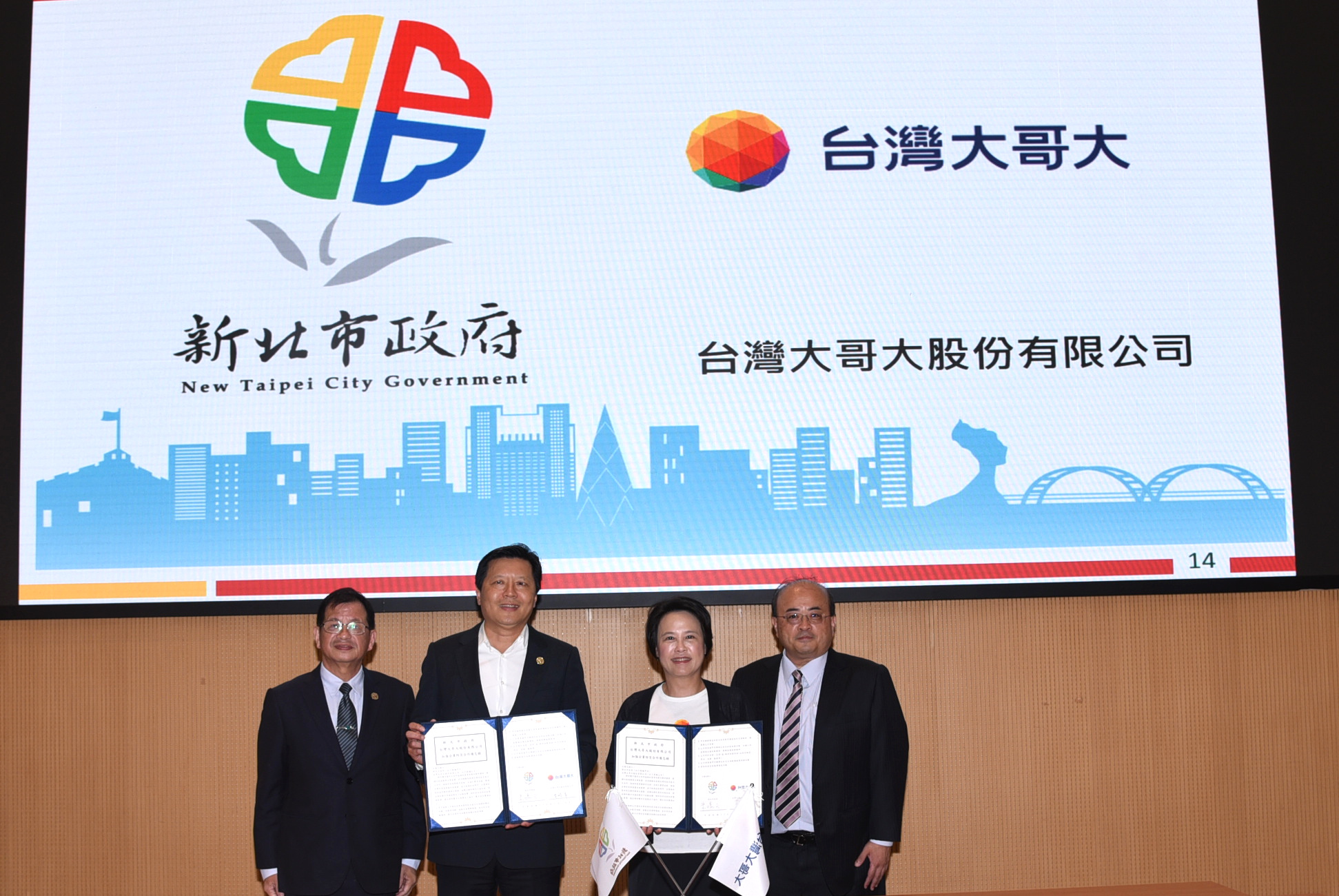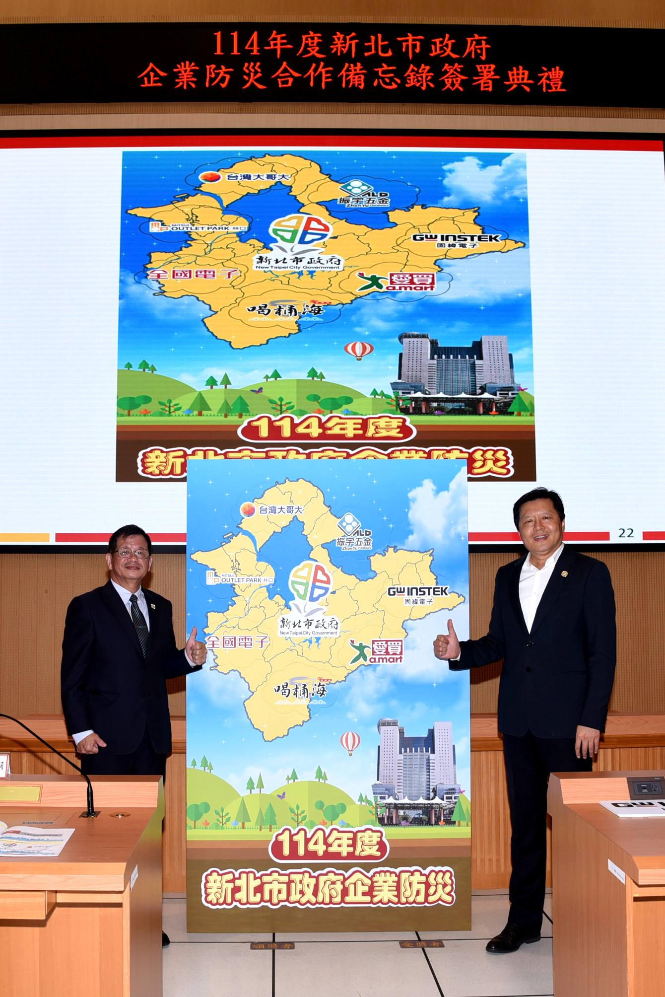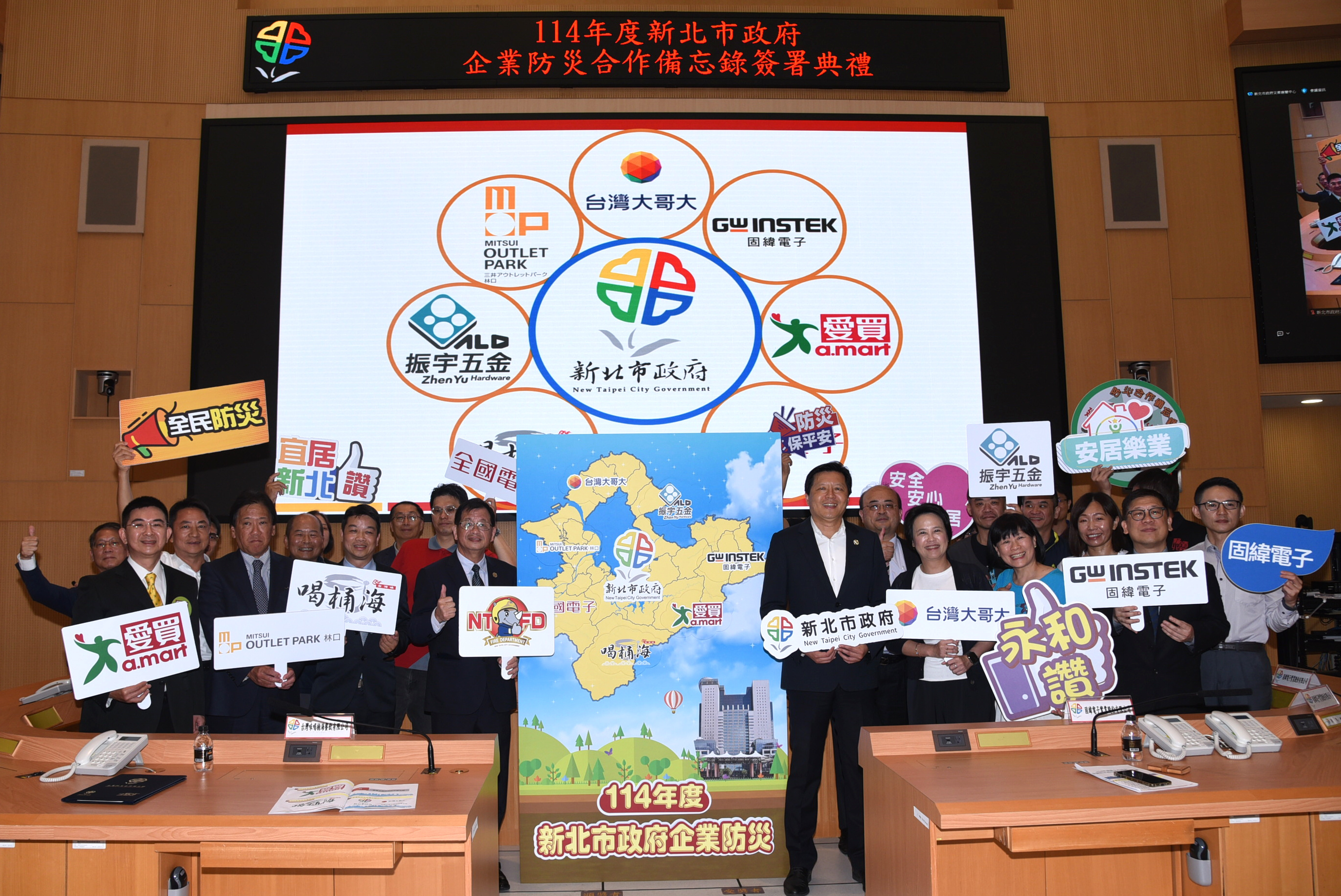 詳細內容:新北市政府消防局為結合民間企業力量共同強化新北市的安全,於114年5月19日在市府大樓9樓災害應變中心辦理114年度企業防災合作備忘錄簽署典禮,由朱惕之副市長代表市府與台灣大哥大股份有限公司、全國電子鶯桃門市、振宇五金股份有限公司、固緯電子實業股份有限公司、三新二奧特萊斯股份有限公司、遠百企業股份有限公司永和分公司、台灣味喝桶海餐飲有限公司等7家企業簽署企業防災合作備忘錄,新北市企業防災推動,至今年度合作企業家數已達到500家之新里程碑,在各企業熱烈響應下,新北市全民防災工作持續成長。