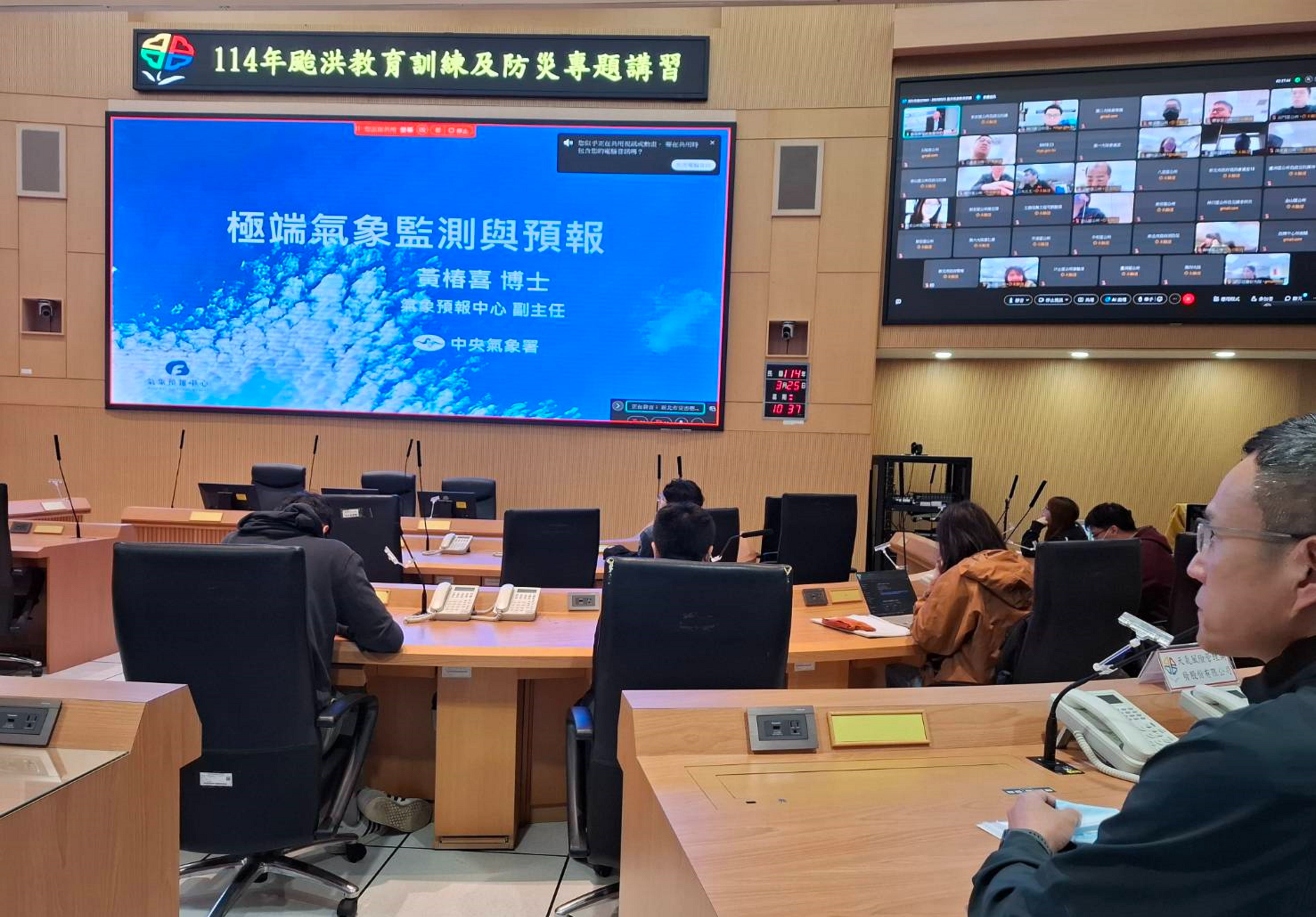 詳細內容:為使本府災害防救人員於災害整備、應變階段可妥善判讀各式氣象水情相關情資,本府於114年3月25日特邀請氣象署黃椿喜副主任、NCDR于宜強組長、天險公司吳聖宇分析師及資訊部林定賢經理專題分享,使本府於災時之整備應變工作更為順遂,共計參訓139人。
