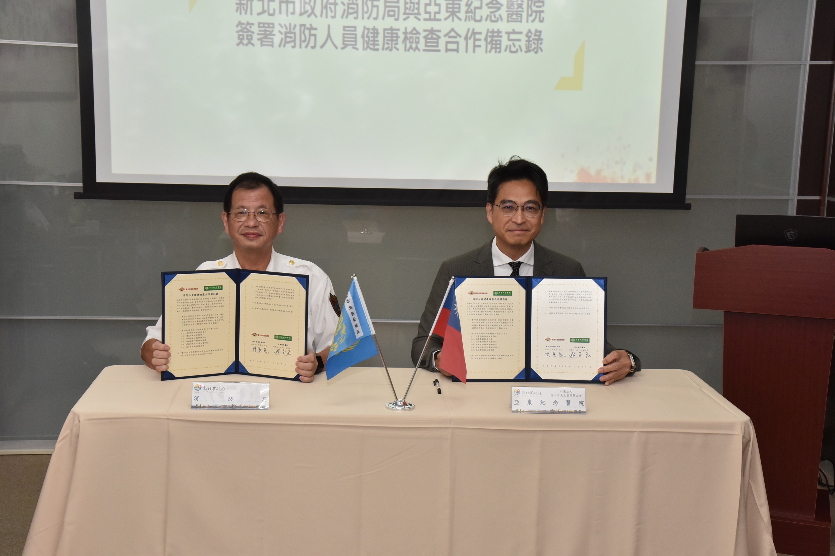 詳細內容:新北市政府消防局為全面守護消防人員健康,於114年8月21日與亞東紀念醫院簽署合作備忘錄,由消防局陳崇岳局長與亞東醫院林子玉副院長共同主持,確立長期合作關係。簽署內容包括定期健康檢查、專屬健康資料庫建置及個別化健康管理,由專業醫療團隊提供量身照護,讓消防人員在高壓與高風險勤務中獲得更完整的支持。