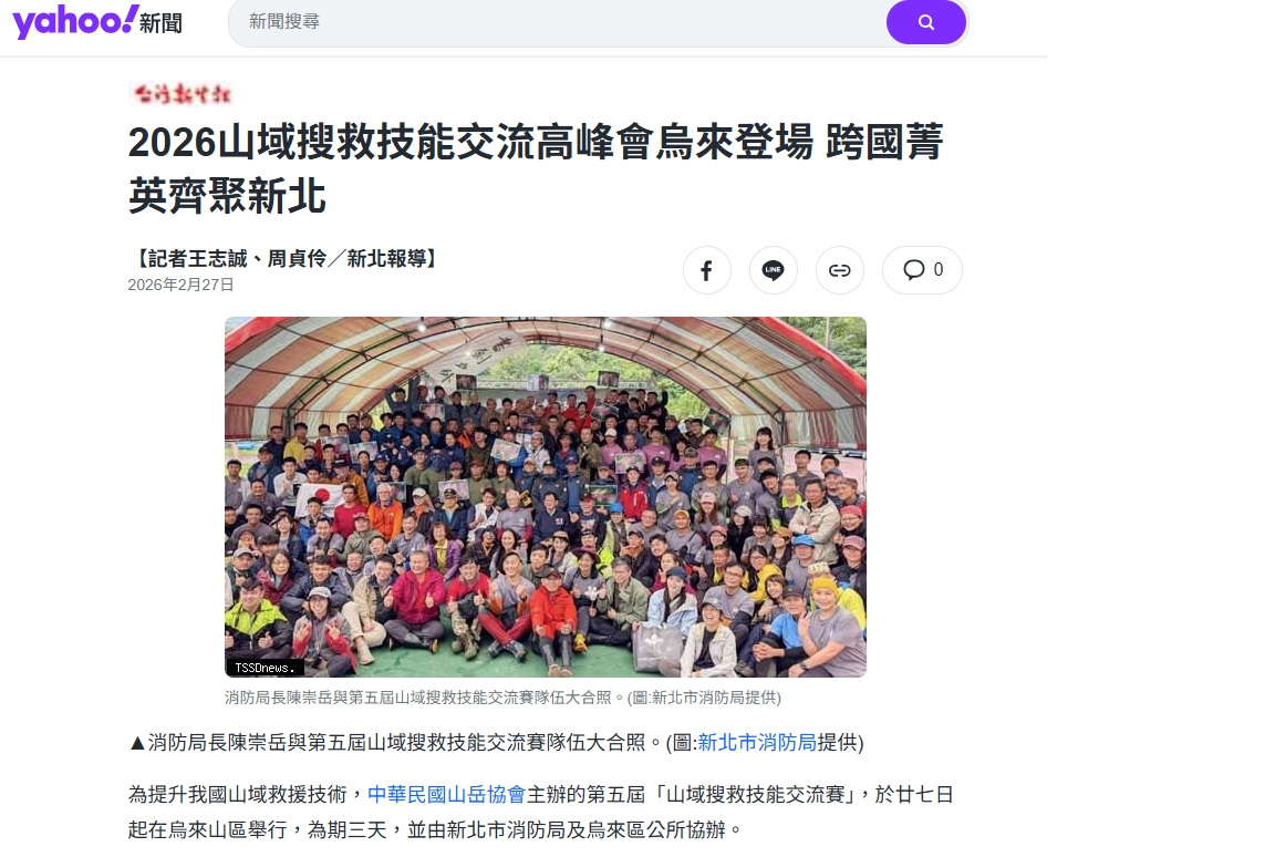 詳細內容:115年2月27至3月1日由中華民國山岳協會主辦,新北市政府消防局及烏來區公所聯合協辦,運動部全民運動署、農業部林業及自然保育署新竹分署共同指導的第五屆「山域搜救技能交流賽」,於烏來山區盛大登場。本次盛會匯集14支來自全國各縣市的搜救精銳隊伍,更首度邀請具有豐富山域與雪地救援經驗的南韓山域搜救菁英「K-Team」(Korean Alpine Rescue Association)及國際繩索競賽團隊Grimp Japan、START JAPAN及ARA代表人員來台一同共襄盛舉,於三天兩夜的模擬實戰環境中,進行高強度的技術交流與經驗共享。本局參賽隊伍有山域搜救專隊大埔山域搜救專隊和新板義消山搜分隊派員組隊參賽。