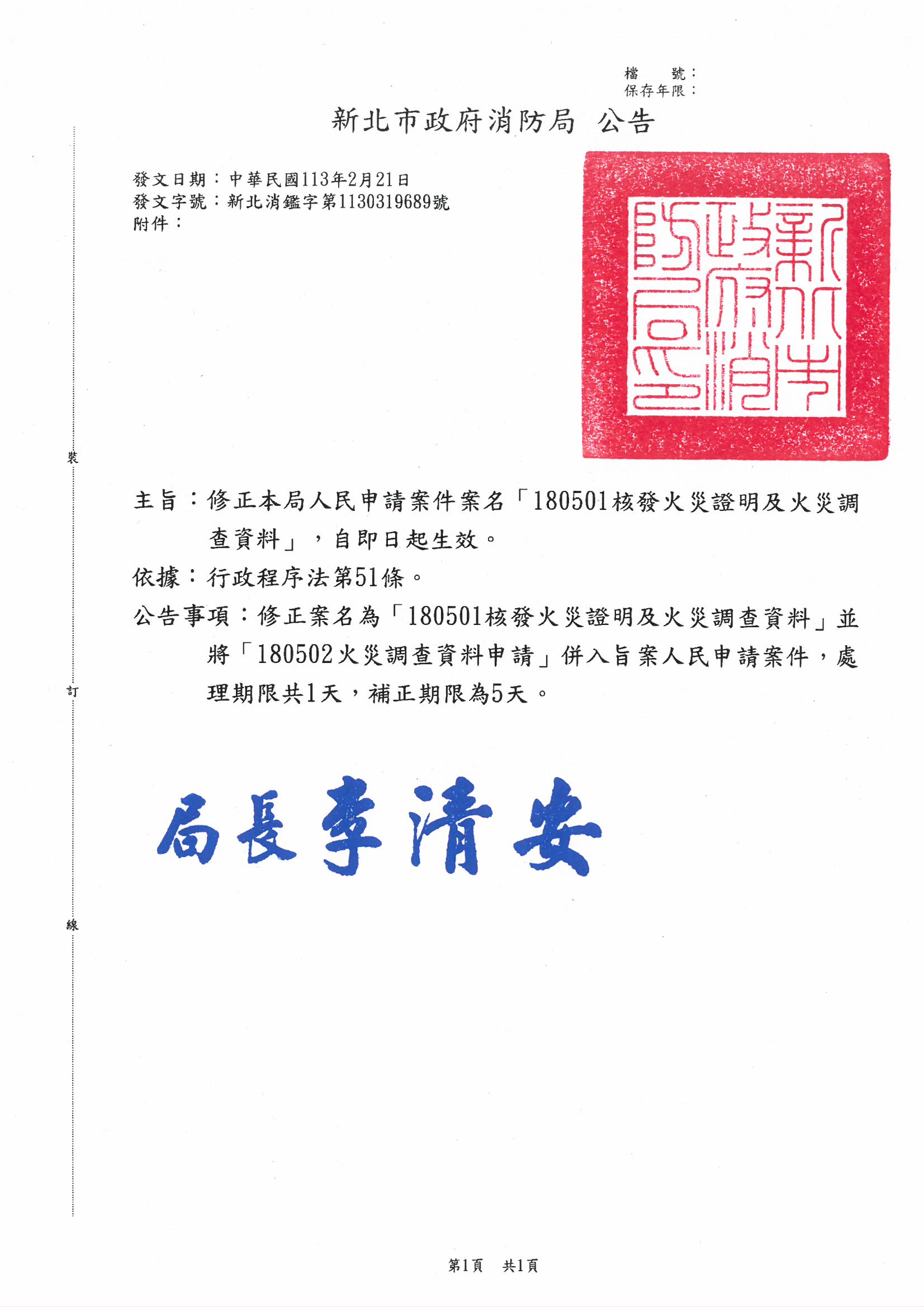修正本局人民申請案件案名「180501核發火災證明及火災調查資料」