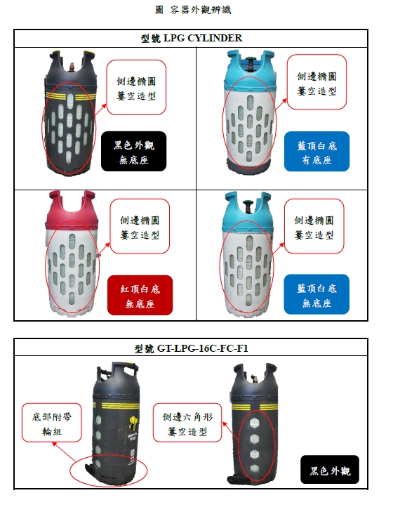新北市政府消防局呼籲民眾,請立即檢查家中複合材料瓦斯桶容器,型號LPG CYLINDER外觀為側邊橢圓簍空造型,顏色有黑色、紅頂白底及藍頂白底3種,而型號GT-LPG-16C-FC-F1為側邊六角形簍空,外觀為黑色者,請拒收使用。如家中發現該類似瓦斯桶時,可先看容器外觀,如圖示之外觀,再查看瓦斯桶護圈上檢驗卡的容器號碼,若號碼在附檔「回收容器號碼清冊」範圍內,則屬不合格的瓦斯桶,請民眾通知瓦斯行儘速配合辦理回收並請消防單位到場協助處置,以維護消費者權益及居家安全。相關網站https://www.nfa.gov.tw/cht/index.php?code=list&flag=detail&ids=1468&article_id=11904。