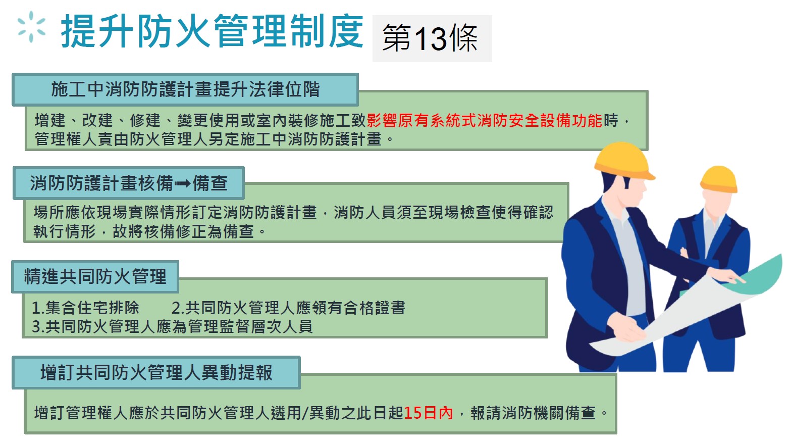 第一項建築物遇有增建、改建、修建、變更使用或室內裝修施工致影響原有系統式消防安全設備功能時,其管理權人應責由防火管理人另定施工中消防防護計畫。