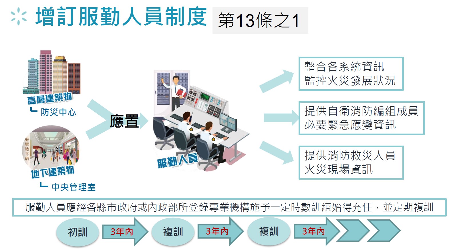 高層建築物之防災中心或地下建築物之中央管理室,應置服勤人員,並經主管機關或經中央主管機關登錄之專業機構施予一定時數之訓練,領有合格證書,始得充任;任職期間,並應定期接受複訓。