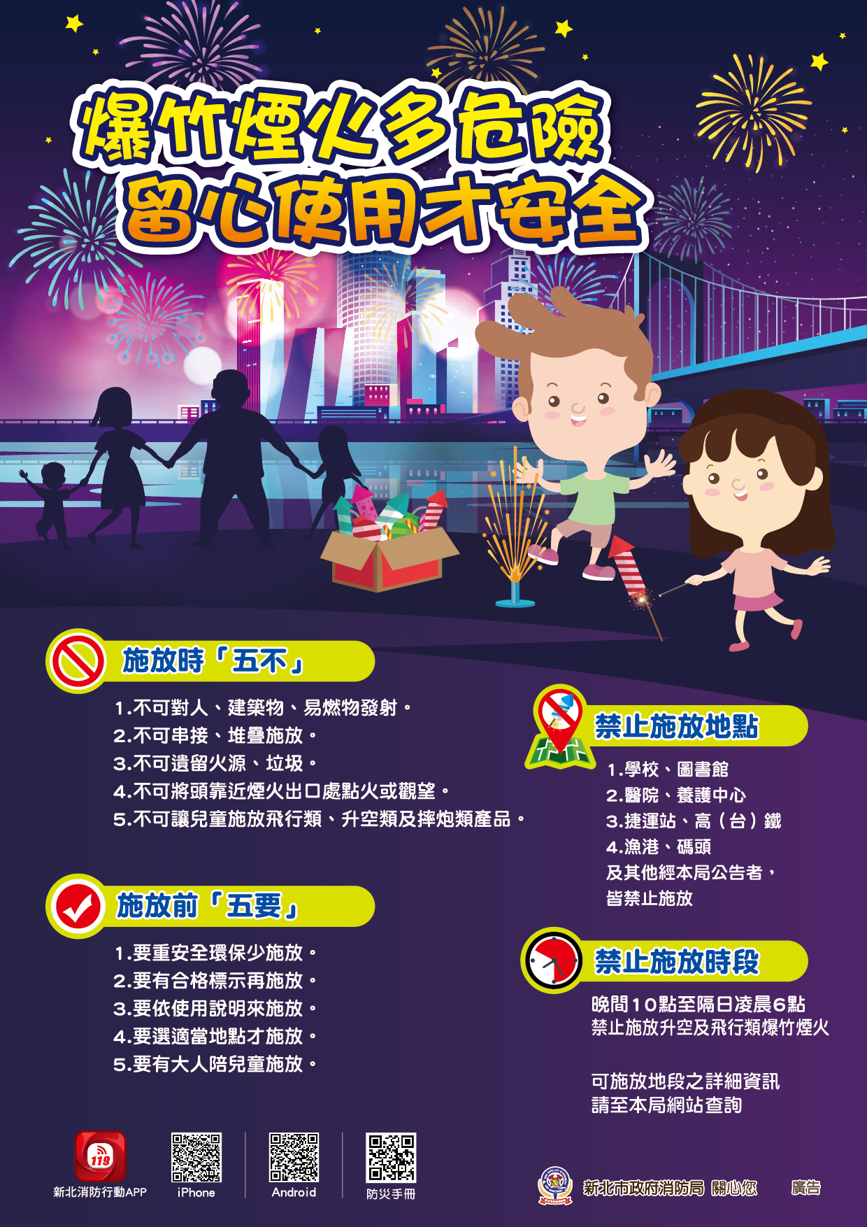 施放爆竹煙火應注意事項: 一、施放爆竹煙火時,嚴禁朝人員、設施物等施放或其他致生危險之行為。 二、施放行為人於施放爆竹煙火時,應朝空曠區域施放並不得毀損河防建造物、堤防、護岸及水門等公共設施;若因施放不當而危害民眾生命財產安全,相關法律責任由施放行為人自行負責。 |