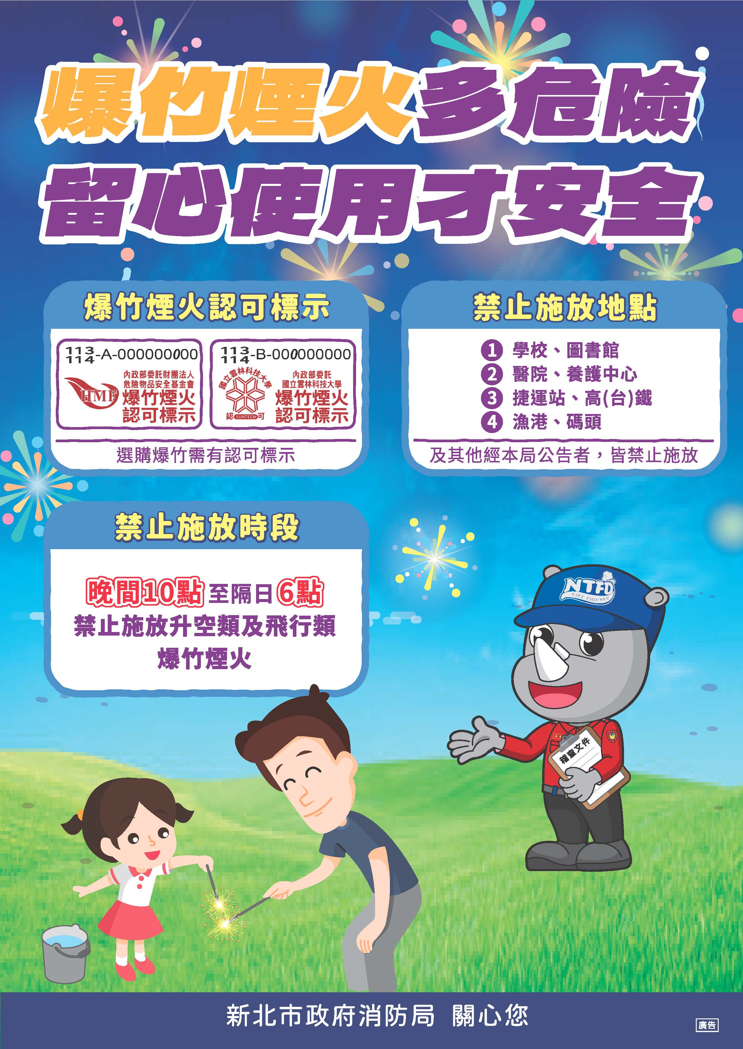 禁止於新板橋車站特定專用區、碧潭風景特定區、淡水漁人碼頭、本市淡水河、二重疏洪道、新店溪、大漢溪沿線河濱公園等地區,燃放爆竹煙火。但新北市爆竹煙火施放專區所列開放範圍、時間及時段,不在此限。違反規定者,依爆竹煙火管理條例第29條第1項第7款處新臺幣3萬元以上15萬元以下罰鍰。